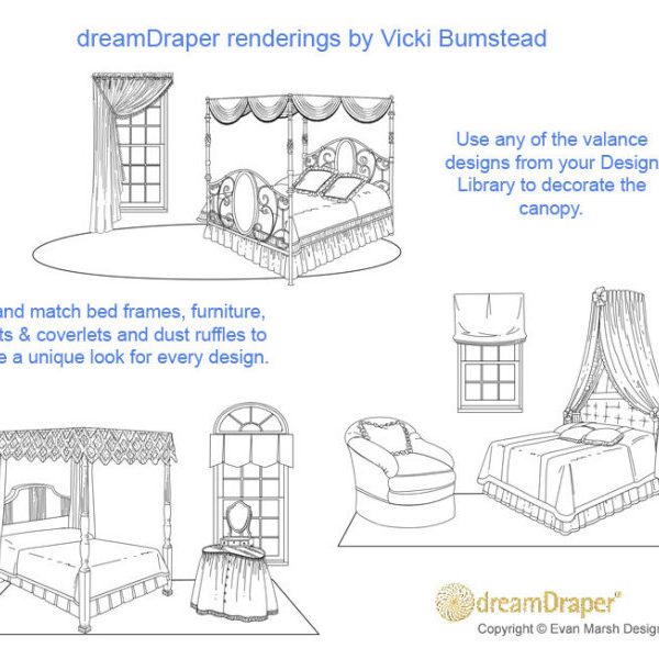 Designs range in style and include popular contemporary, traditional, and even historical treatments and accessories, all of which can be sized to scale and filled with custom color and even your own fabric!