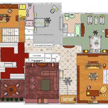 DreamDraper has hundreds of furniture and accessory templates for every room – including appliances, fixtures, rugs, windows, doors, fireplaces, plants, staircases and more. All of these can be easily re-sized and re-positioned to represent exactly the perimeter of a room and the furniture in it.